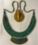 Um Contrapeso (Aegis): Uma peça pesada, em forma de medalhão ou placa, que ficava pendurada nas costas do usuário para equilibrar o peso do colar na frente. Muitas vezes, este contrapeso era a parte mais importante e ornamentada, frequentemente com a imagem da deusa Hathor ou de seus símbolos.